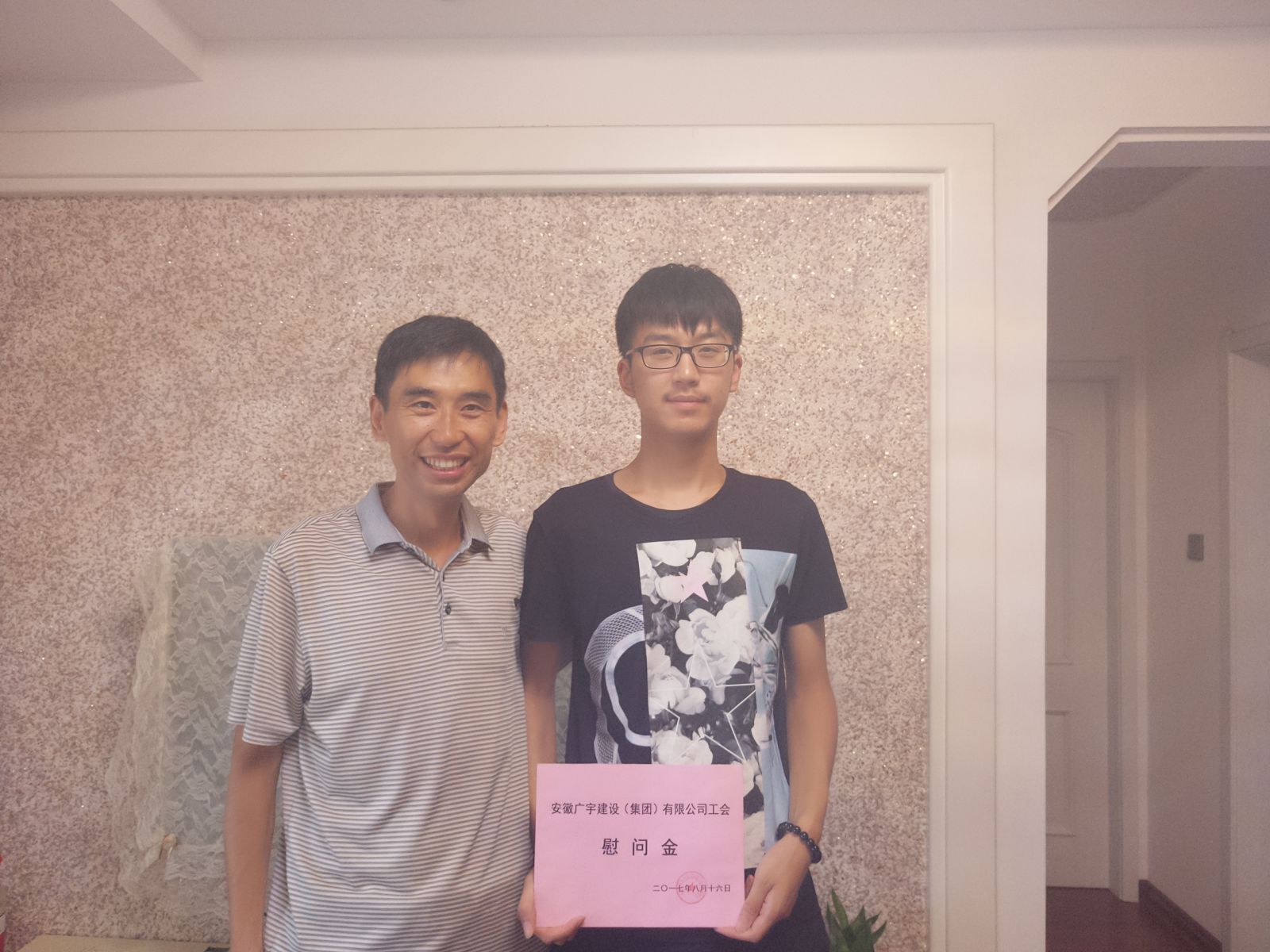 開(kāi)啟新征程,共筑大學(xué)夢(mèng) ——廣宇工會(huì)助學(xué)慰問(wèn)行 金秋八月,激情奔放。8月16日上午,廣宇集團(tuán)工會(huì)人員一行到胡巨偉、張亞偉同志家里,共同祝賀胡巨偉愛(ài)子胡俊杰、張亞偉愛(ài)女張玥兩位學(xué)子金榜題名。十年圓一夢(mèng),終身難感恩。人生如船,夢(mèng)想是帆,兩位學(xué)子勤奮好學(xué),如愿大學(xué)夢(mèng)。工會(huì)王主席寄語(yǔ):希望二位同學(xué)不忘初心,不忘師恩,不負(fù)眾望,在新的求學(xué)路上,一帆風(fēng)順,學(xué)業(yè)有成!