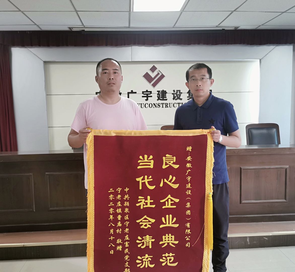 “感謝安徽廣宇建設(shè)集團(tuán)和張董事長給予的無私幫助,今天,我們就是受全村人的委托來當(dāng)面向你們表示感謝的……”8月26日上午,寧老莊鎮(zhèn)曹廟村村民在村支書李二寶的帶領(lǐng)下,將精心制作的“當(dāng)代社會清流、良心企業(yè)典范”、“低調(diào)扶貧真公益、儒雅經(jīng)商似范蠡”兩面錦旗敲鑼打鼓送到了公司,同時還帶來了村民親手種植的農(nóng)產(chǎn)品,用于表達(dá)對公司及張董事長在曹廟村“戶戶通”精準(zhǔn)扶貧工作中大力捐助的感激之情。 張濤董事長對李書記等人如此隆重的到來既意外又歡迎,他深情地說自己和企業(yè)只是盡了微薄之力,沒有想到村里父老鄉(xiāng)親這樣隆重的表達(dá)方式,并表示今后仍會一如既往地為精準(zhǔn)扶貧工作、為社會公益做一些力所能及的事。公司行政副總陳治明、工會主席王健等參加了本次接待活動。